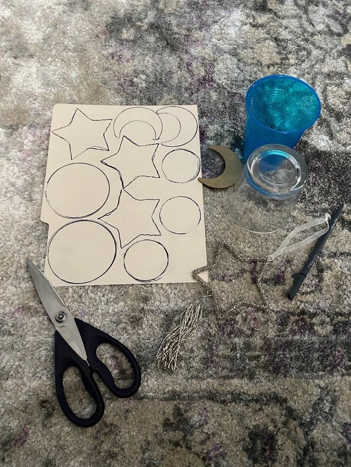 Cut the folders in half, so that you can use both sides of each folder for stenciling. Next, with the cups and other traceable items you have, start creating stenciled designs on the back side of each half of the folder. (As you can see, I traced a wooden moon and a star shaped ornament. Perfect pairing to go with my folder pattern!)
